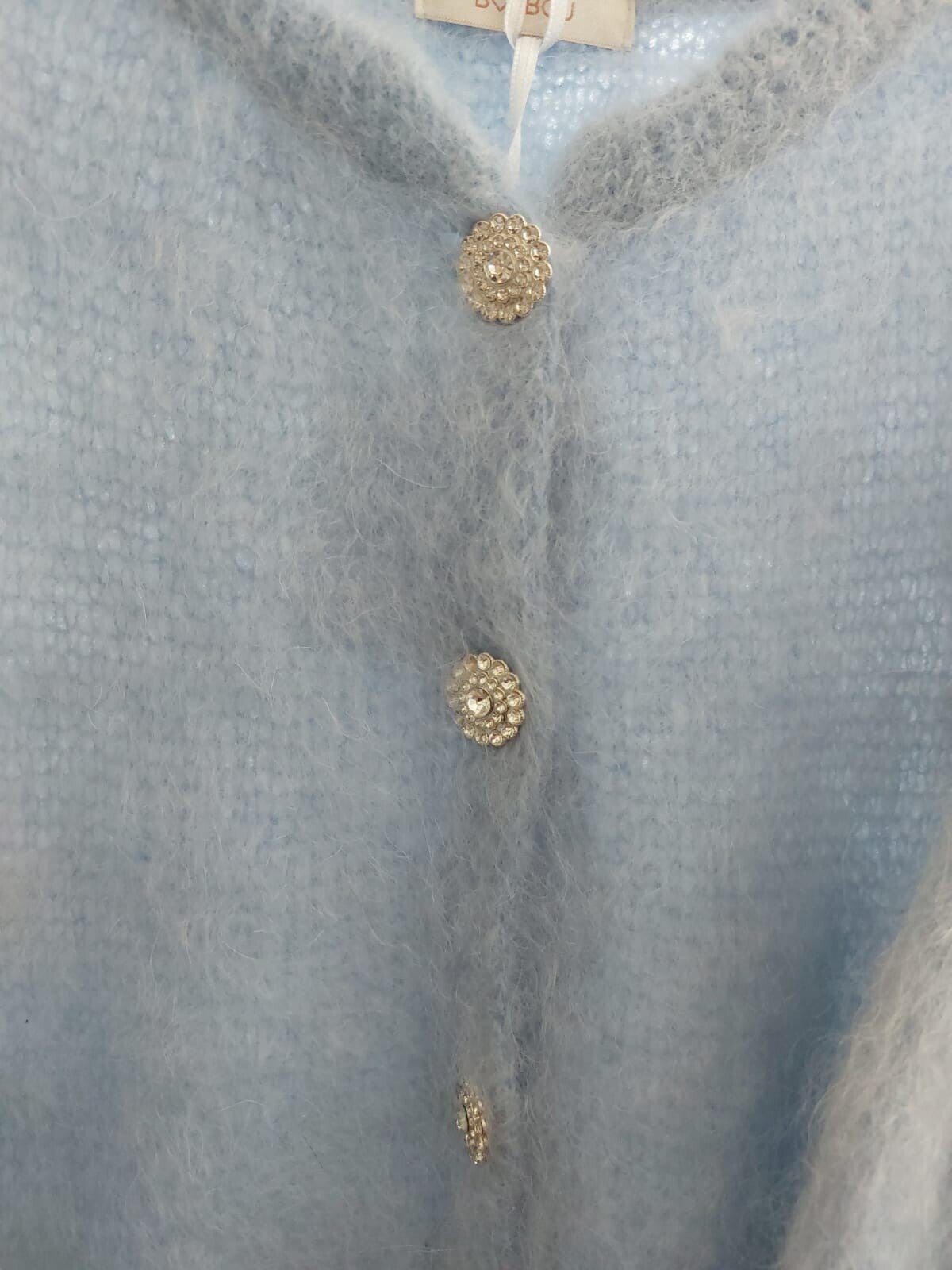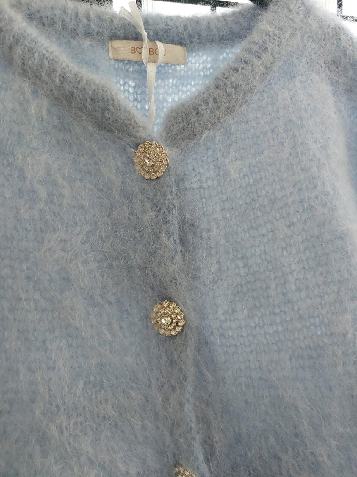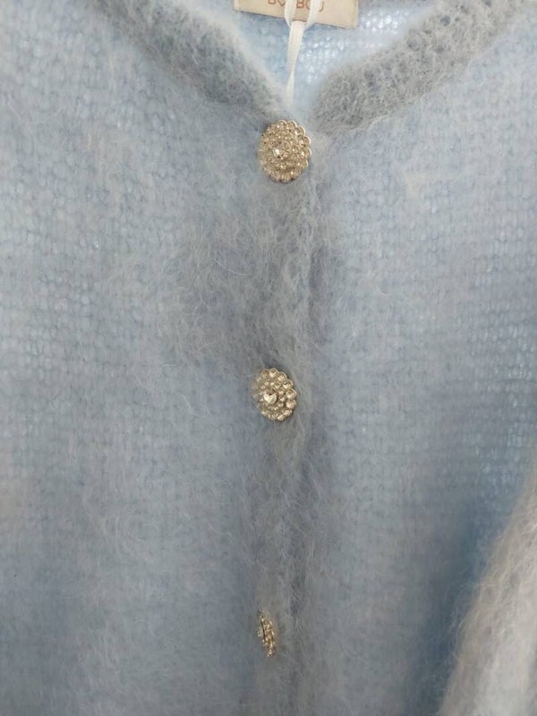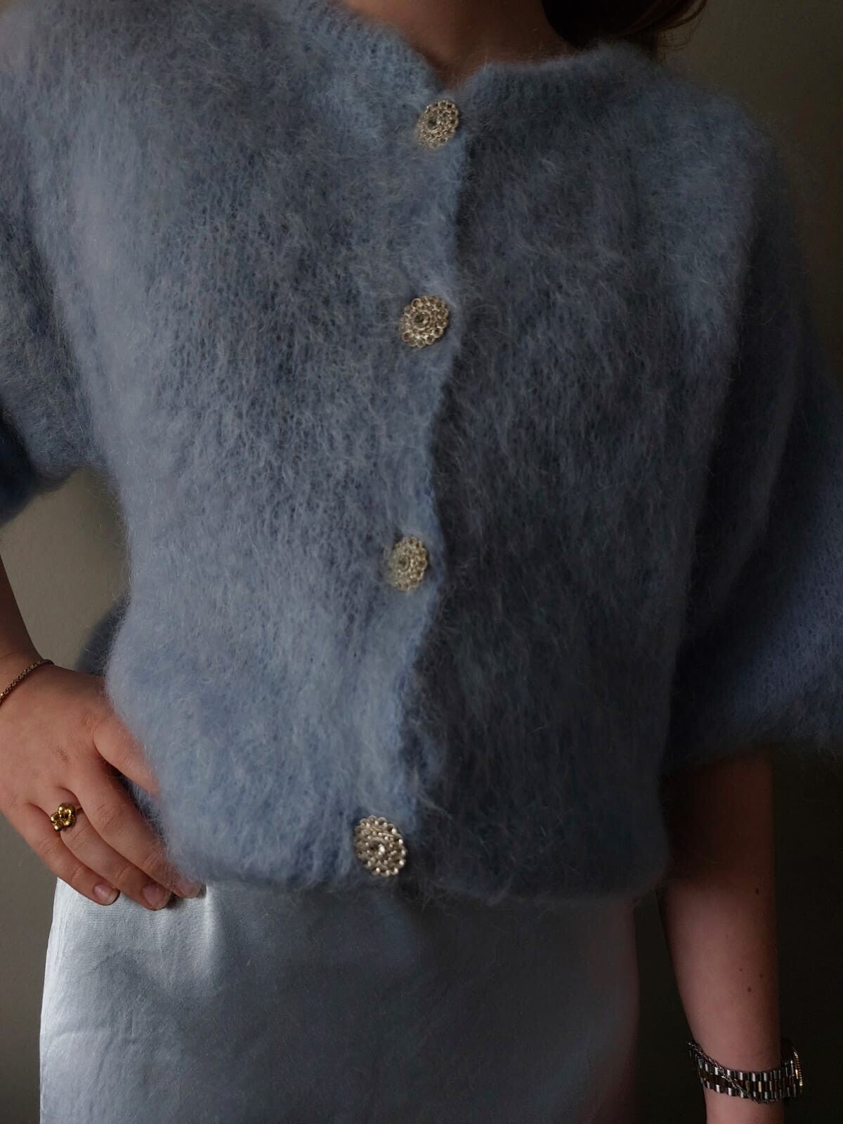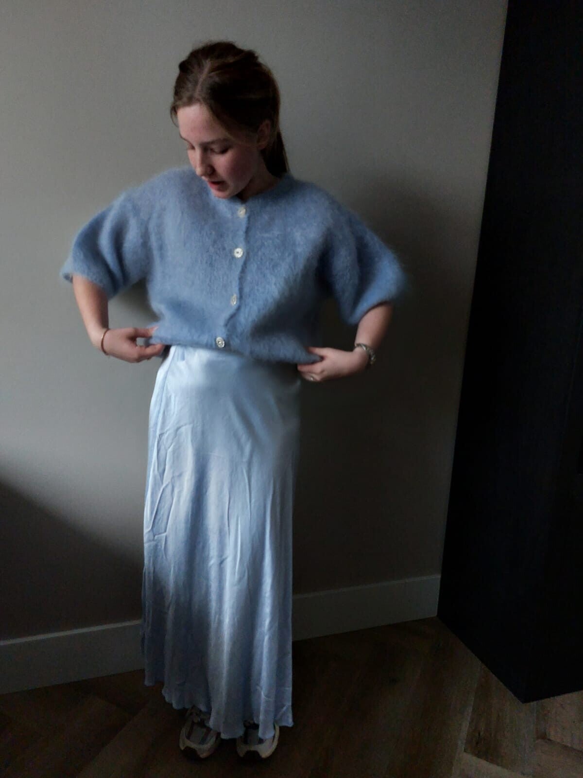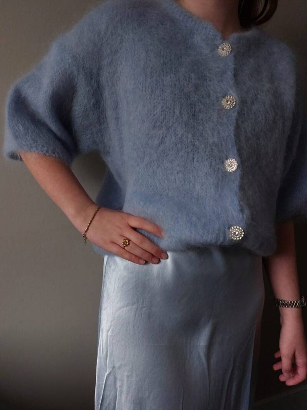 Dit heerlijke zachte en warme vestje past goed op de licht blauwe satijnen rok Anna