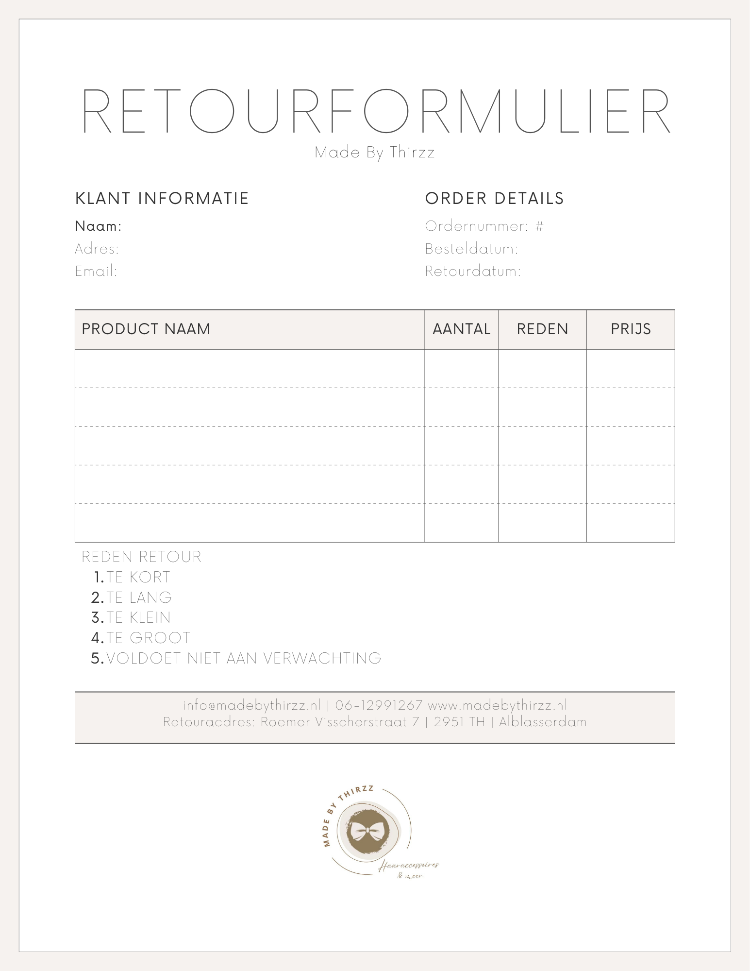 Made by Thirzz is niet aansprakelijk voor de kosten die worden gemaakt voor het retourneren van het product.